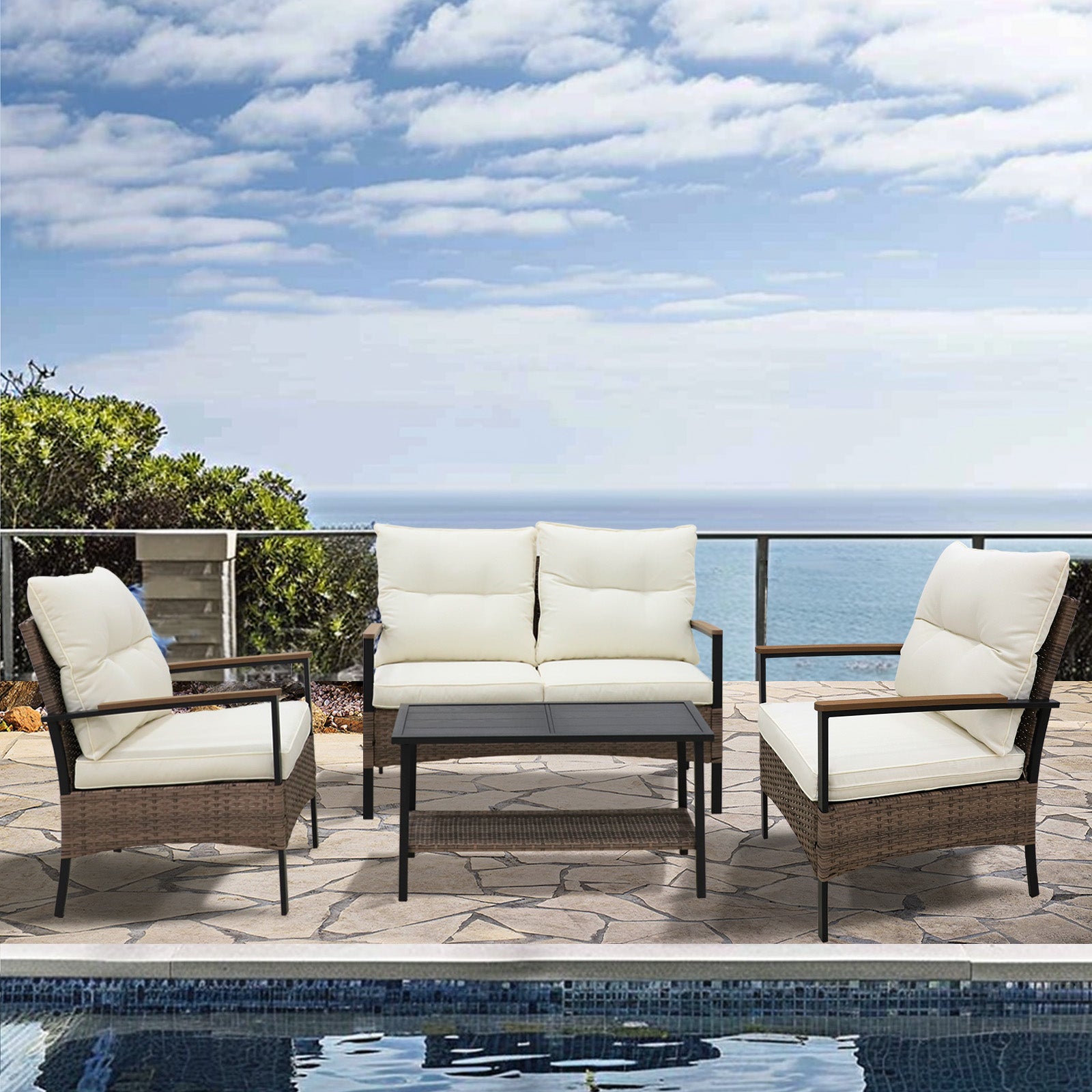 EASY MAINTENANCE W/ WASHABLE CUSHIONS: Enjoy the comfort of thick, soft cushions covered in water-resistant polyester fabric. The convenience of zippered covers allows for easy removal and cleaning, ensuring your outdoor space remains fresh and inviting.