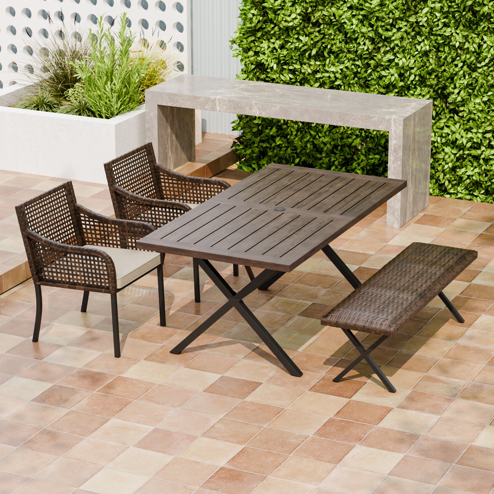 UMBRELLA-COMPATIBLE DESIGN: Crafted with a specially designed umbrella hole, this outdoor dining table provides a perfect spot for your outdoor umbrella, offering cool shade on hot, sunny days and reliable coverage when unexpected rain showers roll in