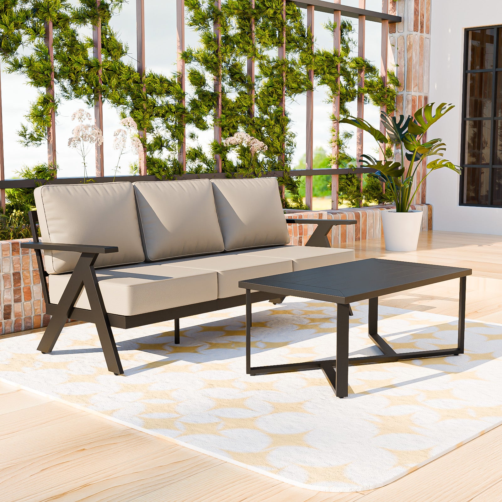 COOS BAY Iron Luxe Modern Outdoor Patio Furniture Set, 2 Piece Heavy-Duty Outdoor Furniture, 3 Seat Couch and Coffee Table Set for Patio, Deck, or Garden, Black/Beige