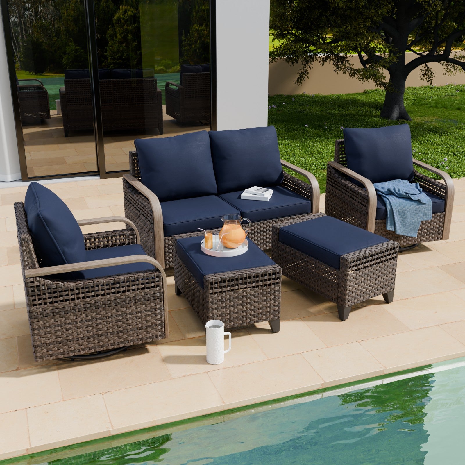 COOS BAY Modern Wicker Outdoor Patio Furniture Set, Patio Conversation Set with Swivel Rocking Chairs, 2 Seat Loveseat, and Ottomans, 5 Piece, Brown/Gray