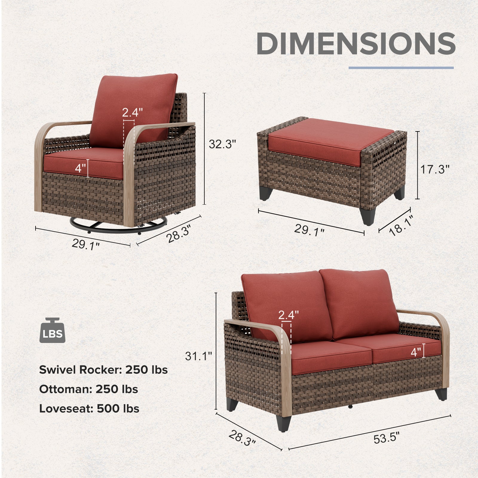 FLEXIBLE MODERN DESIGN: This wicker patio furniture set is designed with versatility in mind, featuring 2 swivel rocking chairs, a 2 seat loveseat, and 2 ottomans. Its sleek and modern design makes it a stylish addition to any setting, whether it's a garden, balcony, patio, porch, deck, poolside retreat, backyard, corridor, or sunroom