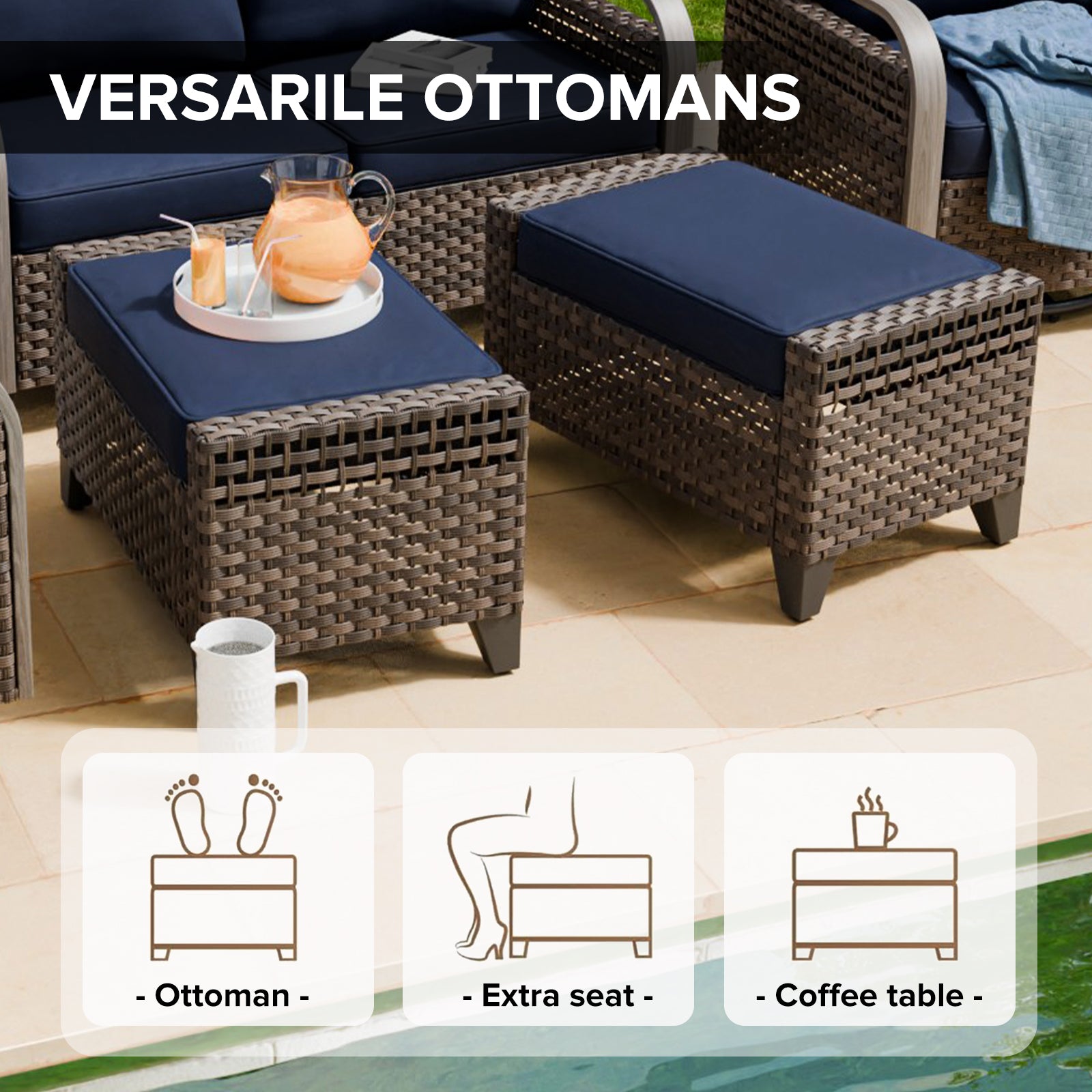 LUXURIOUS OTTOMANS: This outdoor bistro set includes 2 wicker ottomans featuring 4-inch thick, sponge-padded cushions with excellent resilience. Designed to maintain their shape and resist sliding, the cushions also offer exceptional UV protection and water repellency