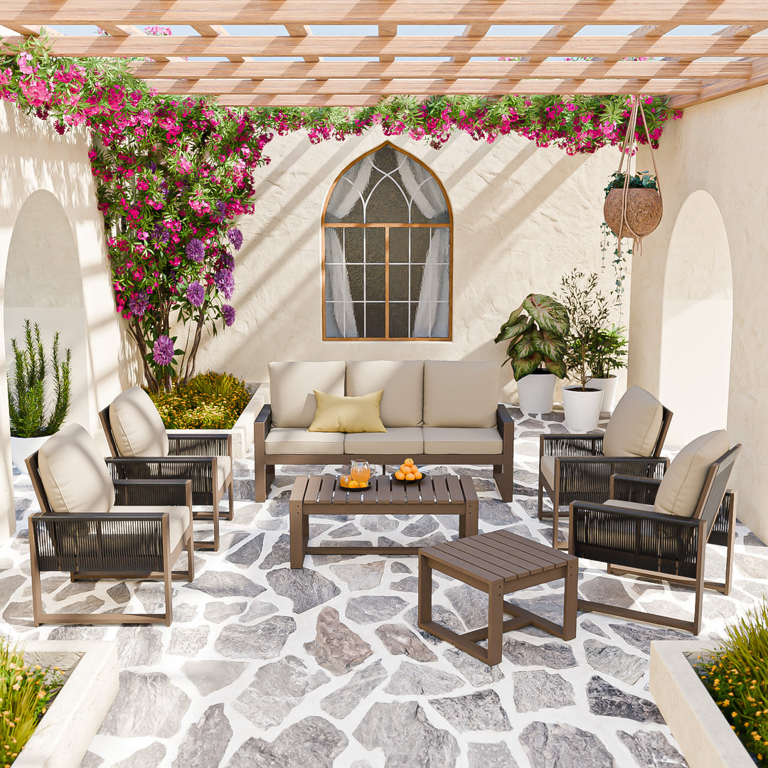 COOS BAY Natural Cedar 6 PCS Furniture Set w/ Sofa 2 Patio Chairs 2 Ottomans and Coffee Table