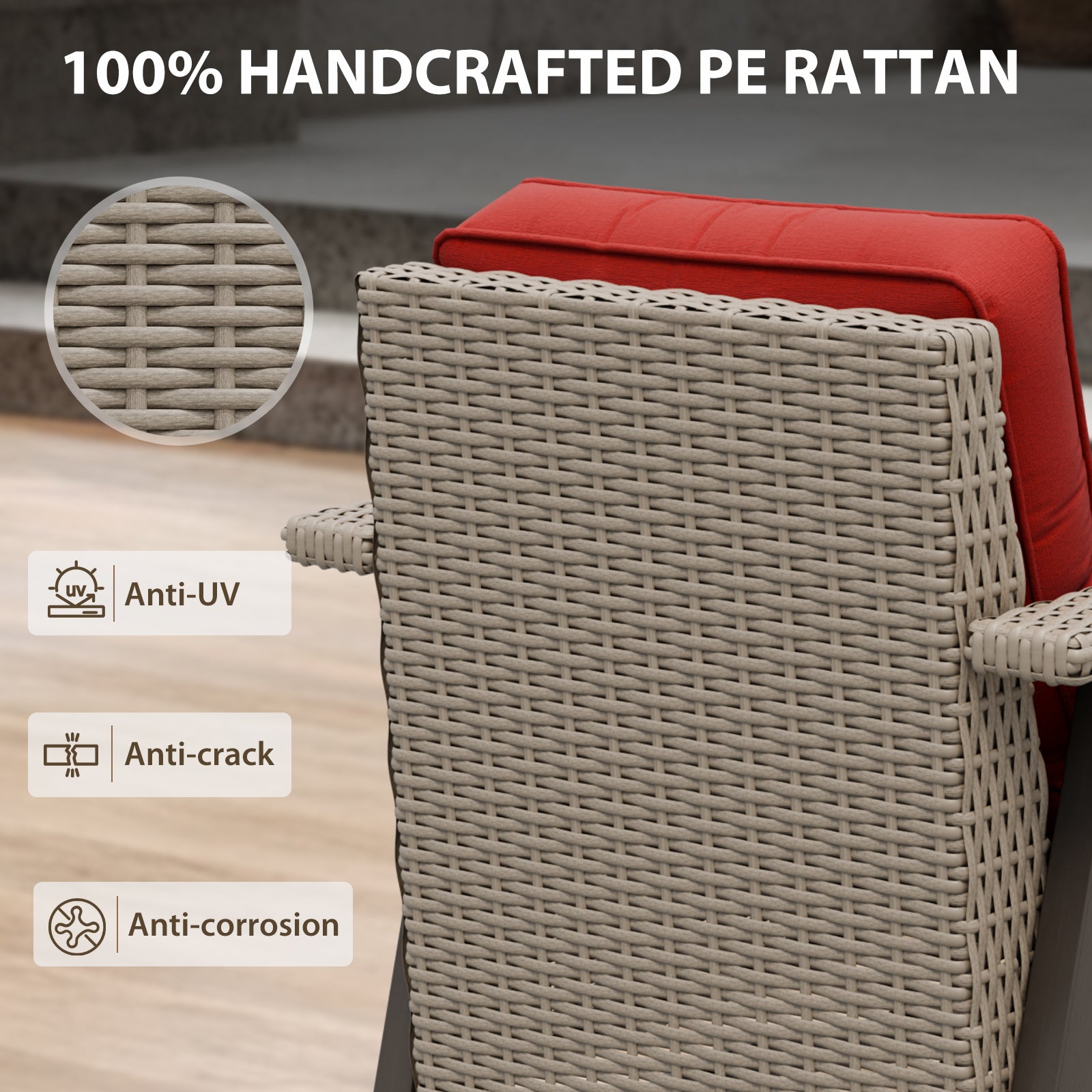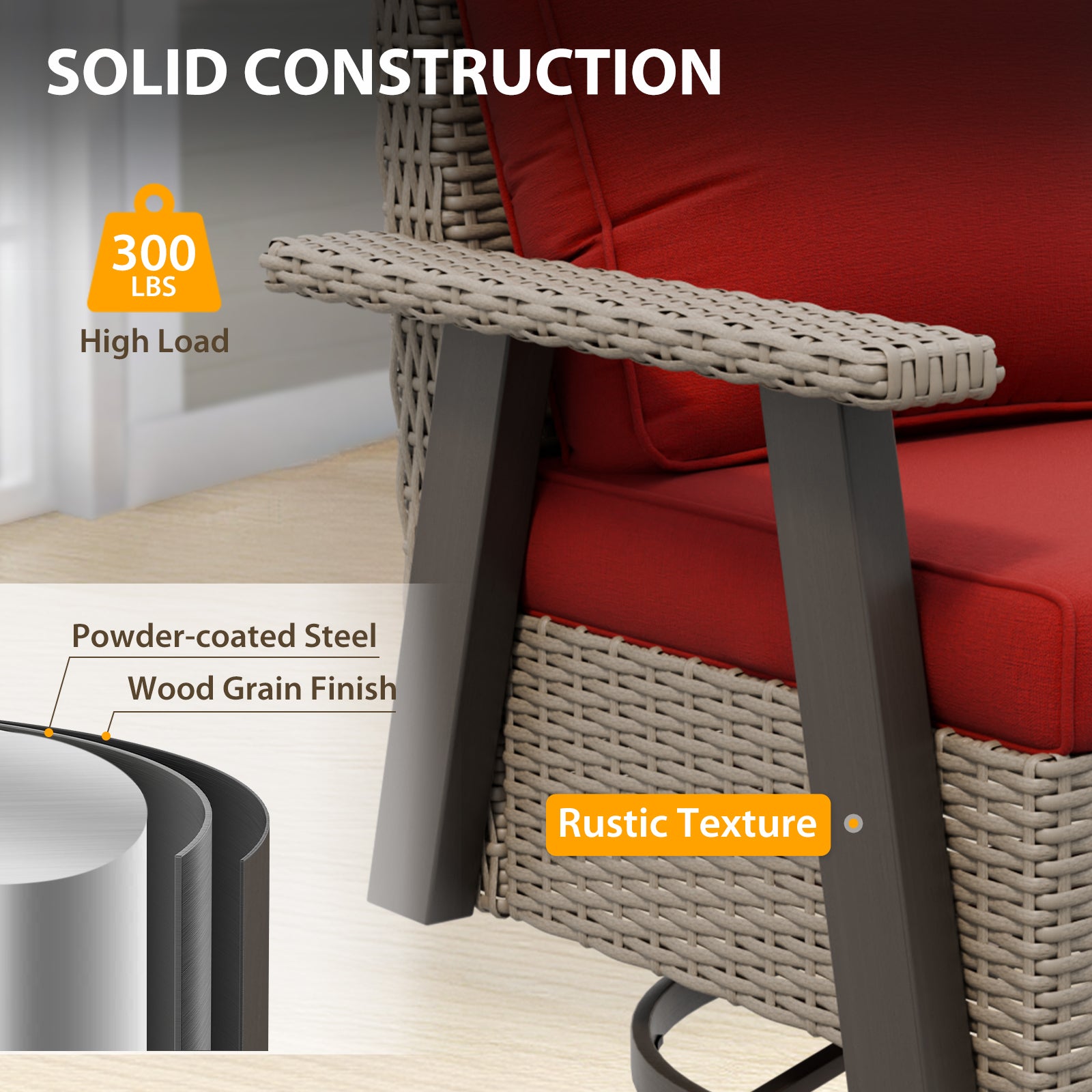HIGH-QUALITY MATERIALS: Built to last, this swivel rocker features handwoven PE wicker and a powder-coated steel frame with a sleek wood-grain finish. It's designed for all-weather durability, resisting cracking, rust, fading, and damage—ensuring lasting beauty and minimal upkeep season after season
