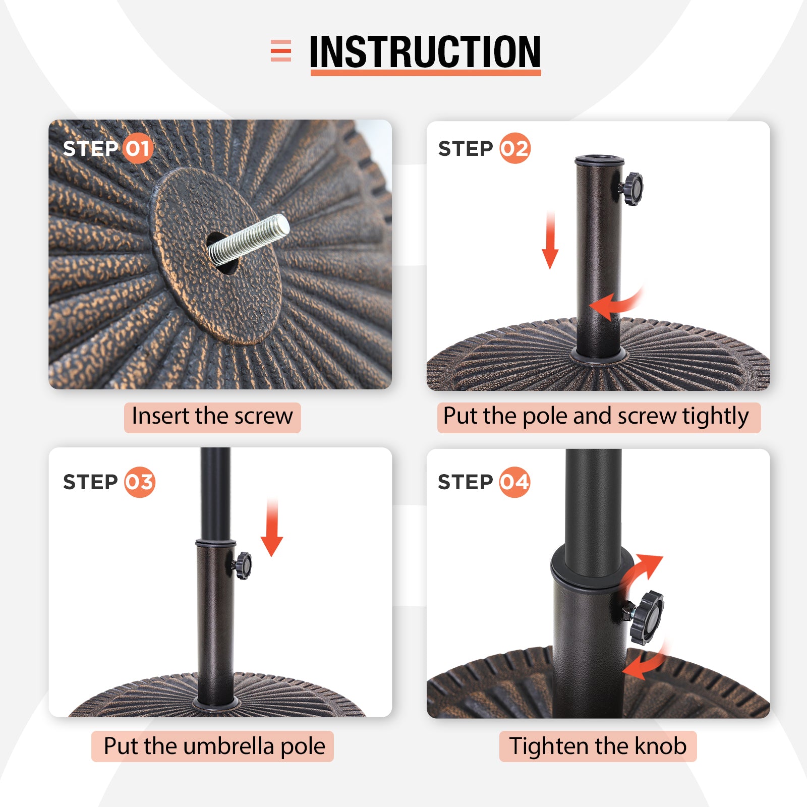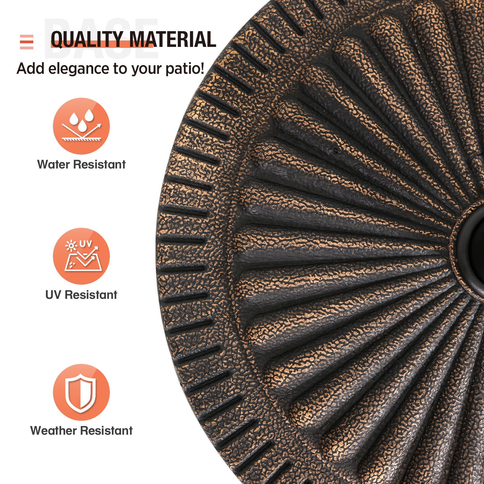 • Premium Resin: COOS BAY umbrella base is made of a high-density resin with steel cylinder to reinforce its structure. It is waterproof, rust resistant, and is UV resistant for long-lasting use. The bronze finish brings class to the backyard!